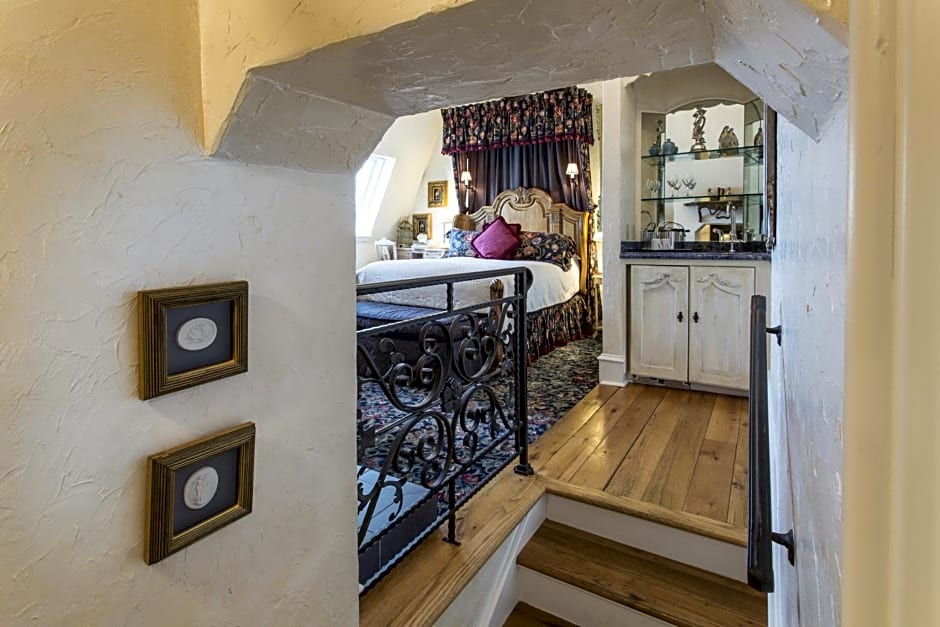 This room features English royalty inspired décor. The bed features a gilded corona from which silk curtains are hung. A fireplace and a jetted tub are provided. A flat-screen cable TV is included. There is a staircase leading to the entrance of the room.